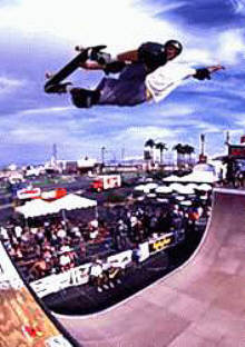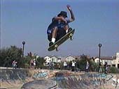 Early eighties arrived with a dive in the skateboarding popularity. It happened almost within a single season. Skateparks closed the doors, manufacturers stopped manufacturing, and worst of all, skateboard magazines switched over to BMXing and rollerskating. But a few hard-core skaters kept on going in both of the continents. Those dedicated skaters advanced skateboarding by creating their own techniques, writing their own magazines, and building some of their own boards and layouts. This was when half-pipes arrived. Simpler and cheaper than pools, they could be built by the skater himself. Half-pipes were usually built of wood and were U-shaped with a ten-foot radius transition on either side with a flat area in the middle, large enough to give you time to concentrate and get speed before hitting the transition. Boarding became unpopular with the public, which in turn pushed the skating scene 'underground'. This might have stifled it but because of the small, but committed group of skateboarder, the sport entered it's most creative stage. Skaters became so envolved with their sport that they wanted nothing else. It was not really a sport, but was becoming a life-style. If not for the commitment of the few, this sport could not have survived the hard times. Skateboarding soon became a mode of transportation. Skaters would go through any and all obstacles in their path. They could, and would, bring their boards anywhere and everywhere. In the early 80's, street skating was born. This new art was free of half-pipes and parks, the skater could DO what he wanted ON what he wanted. Tricks were used in street skating that, before, had only been used by vert skaters. Street ollies, slide'n'rolls, and kerb grinds (most of which have different names now) are classic as street skaters moves, all of which were made by vert skaters.